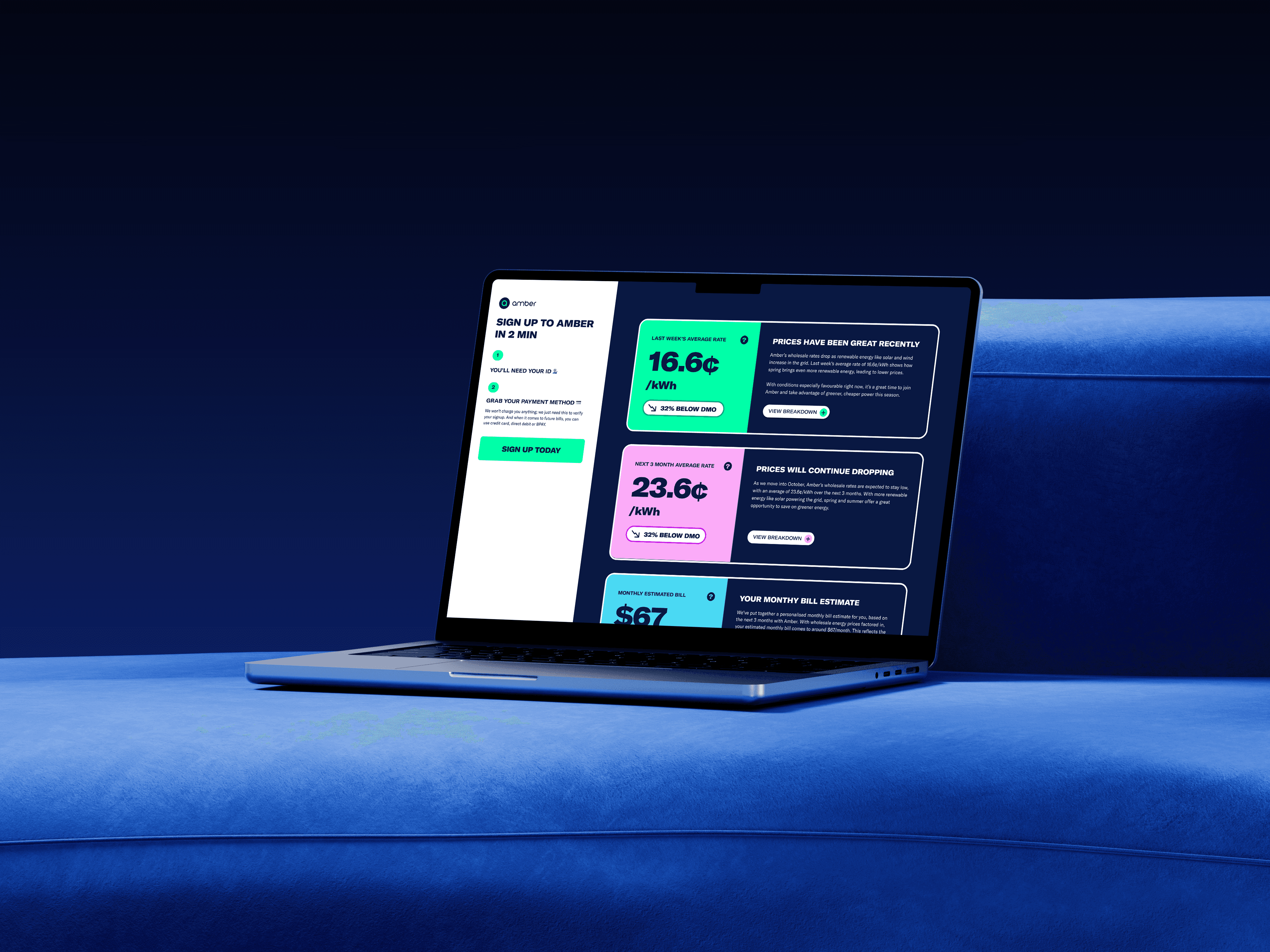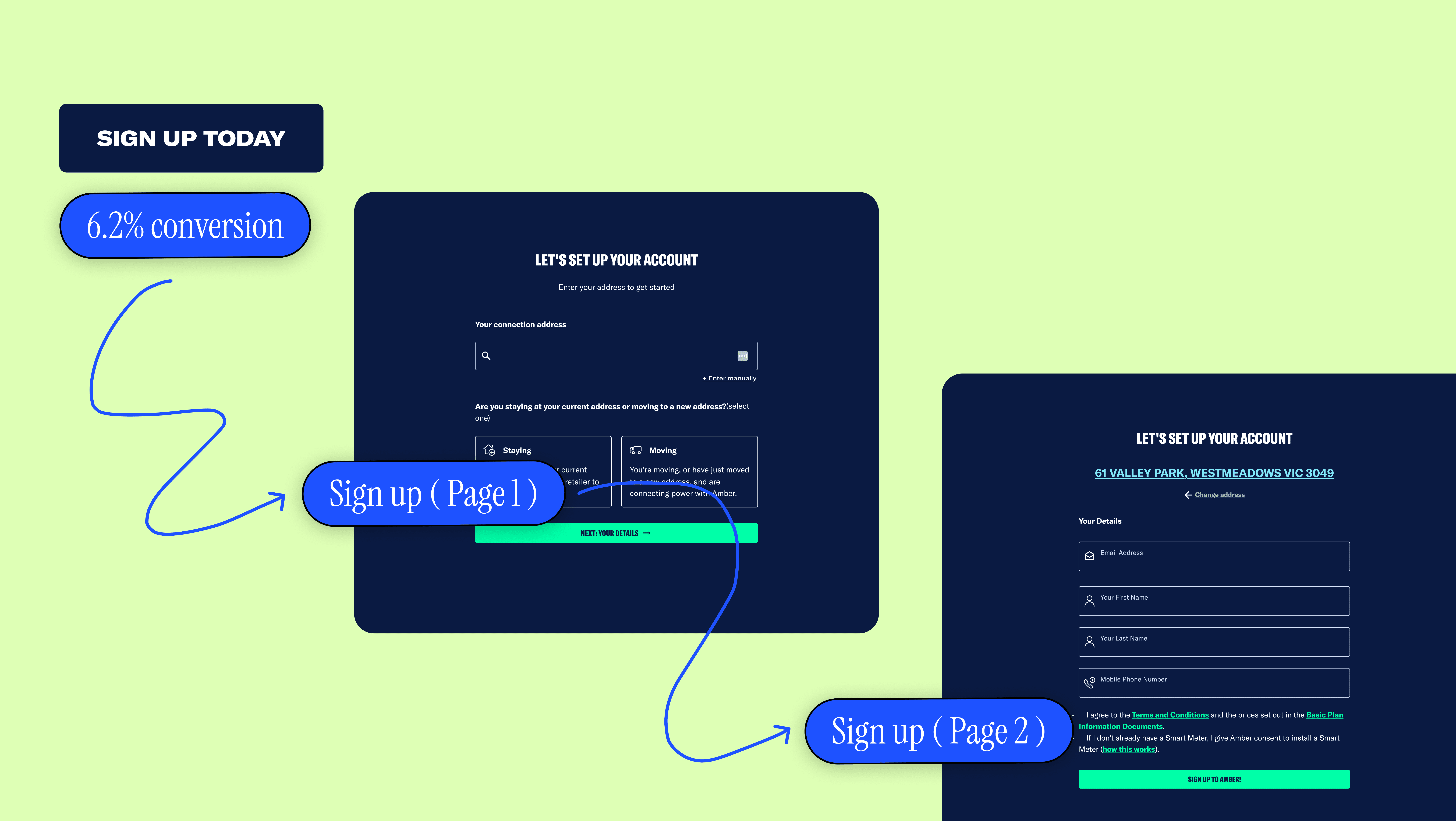 Each designer led their own variant. The first designer (Variant A) kept the multi-page structure but made it more ambitious: surfacing live pricing, spring seasonality data, and making a much clearer case for "now is the best time to join Amber." Mine (Variant B) went the opposite direction entirely. I stripped the whole thing back into a single page, betting that simplicity at its most extreme would convert better. We ran both in a 50/50 A/B test from October and let the data decide.